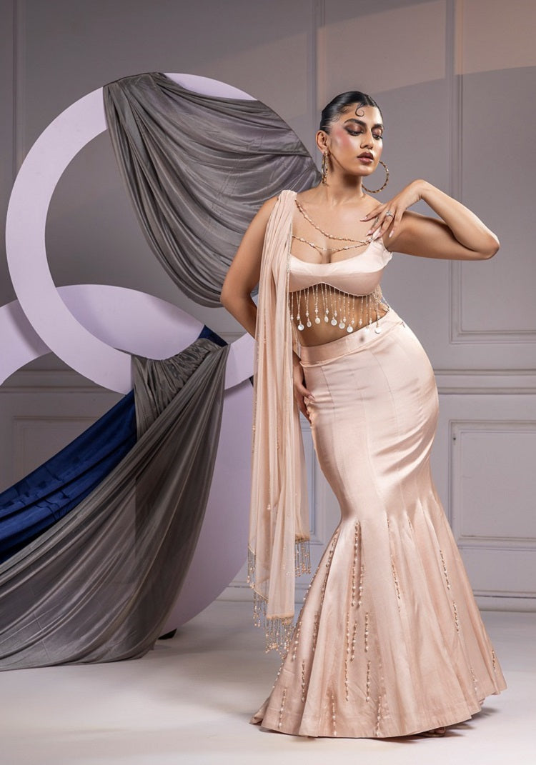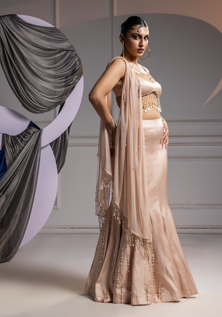 Beige cutdana crystal tassel bustier paired with tassel fishcut skirt and matching tassel dupatta