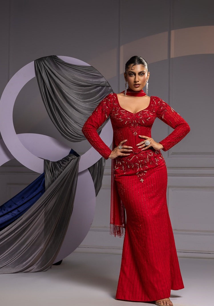 Bold red full sleeves corset with intricate floral and lines emb, paired with body hugging skirt, hand emb and sheer fringed dupatta